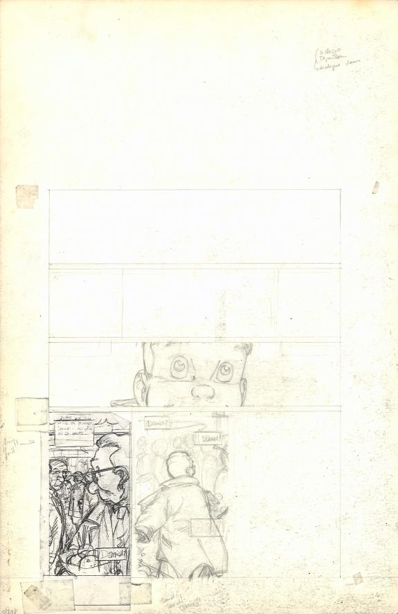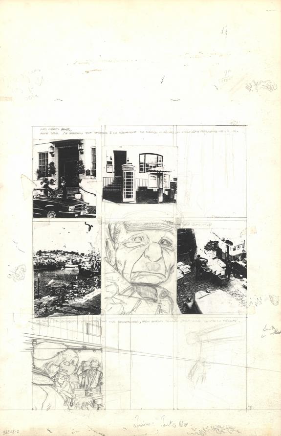 > Catalogue > Michel Plessix > Julien Boisvert > Gris noir > Planches préparatoires n°1 et 18 avec reproductions collées, et planche originale n°18 avec son lettrage collé
