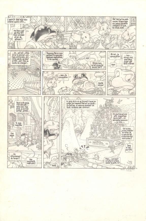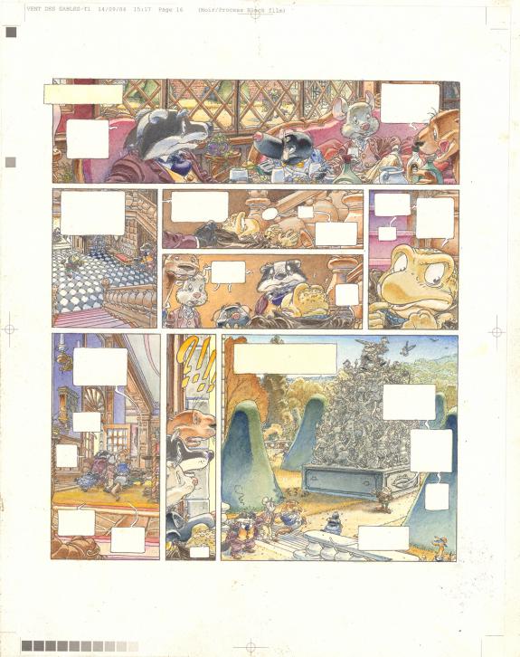 > Catalogue > Michel Plessix > Le Vent dans les Sables > L'Invitation au voyage > Planche originale n°16, accompagnée de sa mise en couleurs à l'aquarelle (24,7 x 31,8 cm)