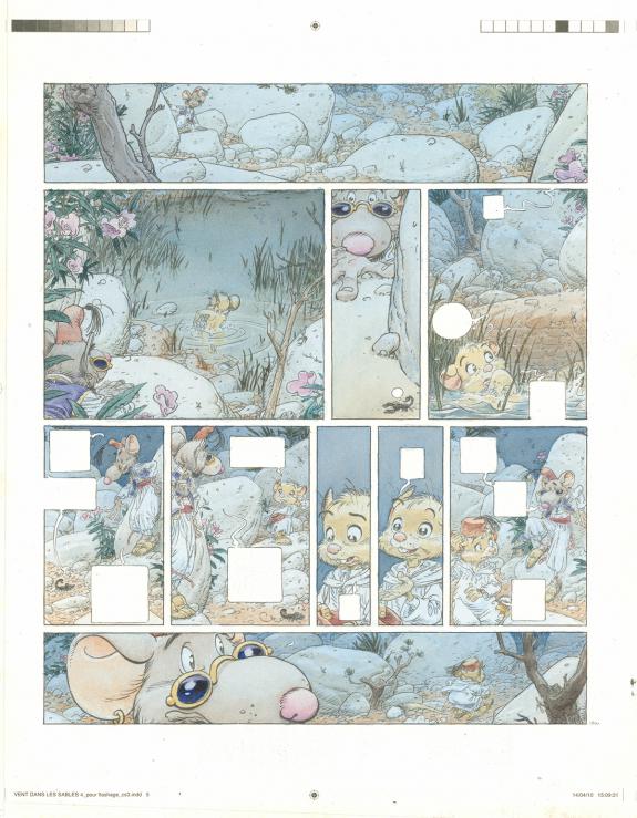 > Catalogue > Michel Plessix > Le Vent dans les Sables > Le Chant des dunes > Planche originale n°100, accompagnée de sa mise en couleurs à l'aquarelle sur papier (25,5 x 33,2 cm)