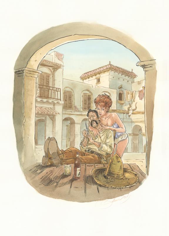> Catalogue > Paul Salomone > L'Homme qui n'aimait pas les armes à feu > Album sans titre > Illustration originale, accompagnée de sa version couleur à l'aquarelle